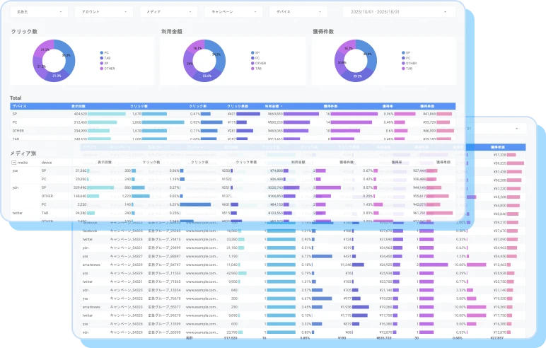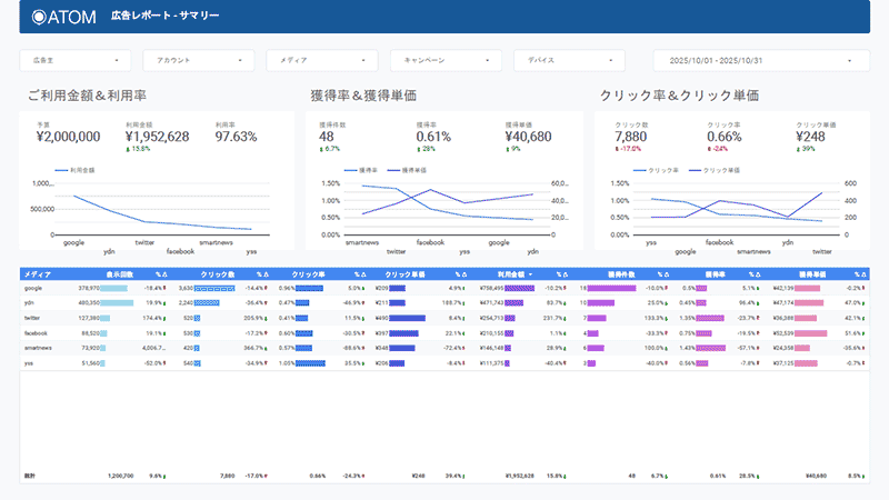 集計期間やフィルタを変更して自由な切り口で数値を確認できます。